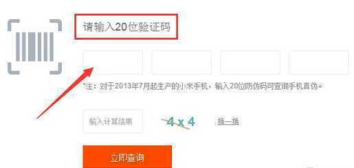 步骤四:然后把你收到的小米4包装盒背面的防伪图层刮开,输入图层后的20位防伪标识码,再点击“立即查询”,即可立刻知道你购买的小米4是真还是假的了。