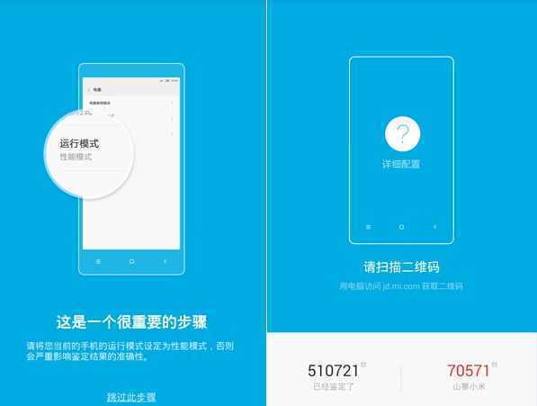 步骤二:点击“小米鉴定”,这时会要求你将手机运行模式设置为“性能模式”,再用电脑输入“jd.mi.com”进入。