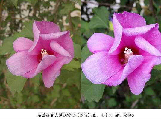 小米4主摄像头为索尼IMX214堆栈式1300万像素摄像头,持硬件级实时HDR和4K视频录制,前置摄像头则为800万像素,而荣耀6主摄像头为索尼第四代BSI堆栈式1300万像素索尼第四代BSI堆栈式摄像头,配备双LED闪光灯,前置摄像头则为500万像素,两者对于色彩有所不同,荣耀6色彩更鲜艳些,小米4色彩自然,各有侧重。