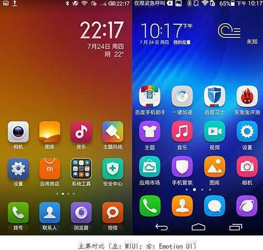 两者的UI系统在锁屏界面上存在较大的差异,Emotion UI从左右两侧向内滑动即可解锁,滑动过程中,桌面会局部快速增加透明度露出桌面,解锁动作完成之后锁屏界面完全消失,而MIUI则基本沿用了原生Android系统的解锁方式,把一个圆心向外拖动,圆的四周有四个功能区,拖到哪个就直接进入功能界面,比较简单直观。