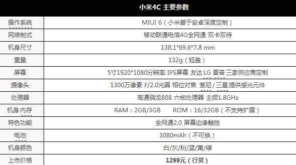 小米4c高配版定价为1499元,低配版为1299元,主要参数如下: