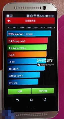 HTC One M8的跑分结果界面:超过了三星Note 3、索尼Xperia Z Utra、小米3、LG G2、TCL idol X+、三星S4、HTC One,HTC One M8基于安卓4.4的Sense 6.0界面,支持Micro SD卡,这还有待揭晓。
