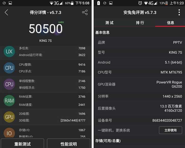 性能方面,PPTV KING 7s搭载了八核helio X10处理器,它采用了ARM的八核Cortex-A53架构,主频最高达2.2GHz,支持2100万摄像头,支持LTE Cat.4网络,采用28nm制程,性能不错,系统运行也流畅,相应速度快,以下是跑分结果: