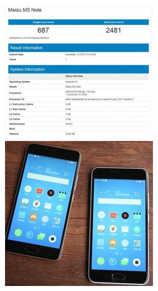 这款命名为魅族M5 Note的型号预装安卓6.0系统,采用MT6755M也就是降频版联发科P10处理器(最大频率仅有1.00GHz),辅以3GB RAM。这款疑似为魅蓝Note5设备单核心跑分为687,多核心得分为2481,魅蓝Note5通过了3C认证,目前手机配置细节信息还不清楚。