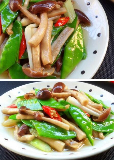 1.茶树菇洗净切段,荷兰豆洗净对半切后焯水烫熟;