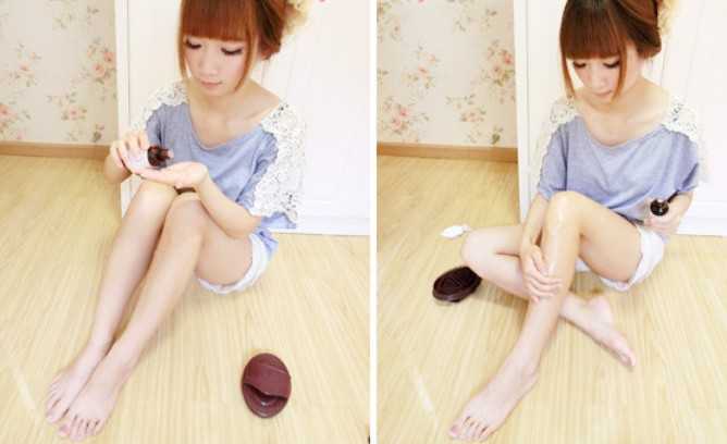 第二步:擦干美腿以后,那就是开始进行涂抹了,倒10滴精油左右,涂抹在腿上,可以根据自己的腿部不同调整精油的用量!