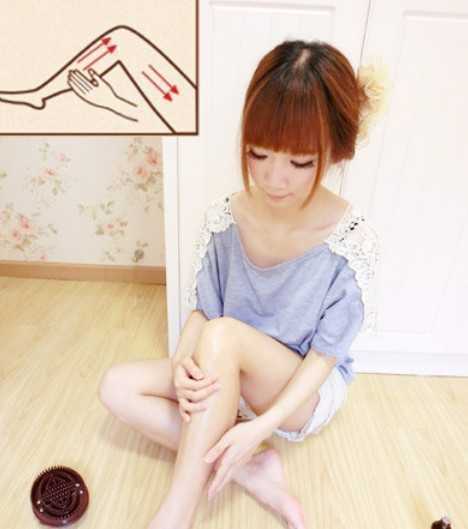 步骤三:精油的涂抹是有技巧的哦,应该由下向上涂,这样可以通过按摩腿部的赘肉,提拉肌肤!