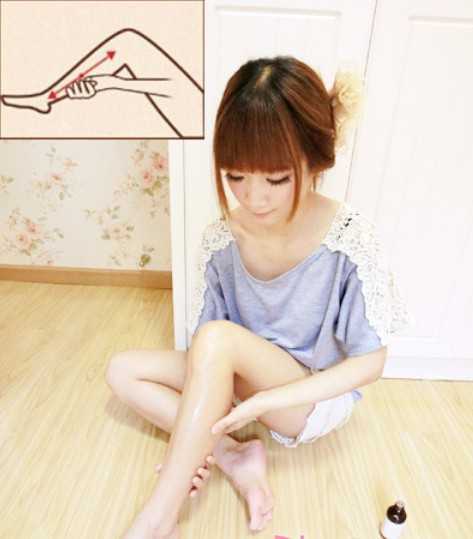 步骤五:由小腿的中间开始,两手同时向上下两边进行按摩,刺激小腿的淋巴,帮助血液循环!