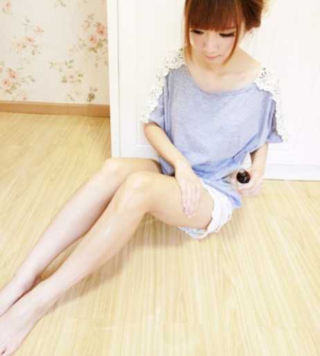 步骤六:完成了小腿的按摩,下面就到大腿的按摩了,看美MM的演示,大腿的精油按摩是,简单的按摩两侧,达到消瘦大腿的效果!