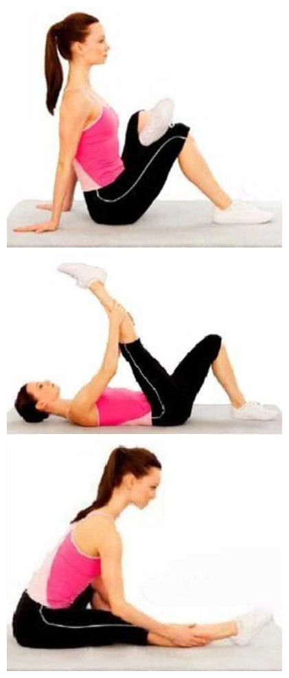 坐姿,臀部着地,双腿弯曲,脚掌完全着地,双臂撑在背部后方,手掌着地,背部微微后倾,左脚抬离地板,并放在右膝盖上方,尽量撑直左腿,左膝盖尽量压低,换到另一边重复做。