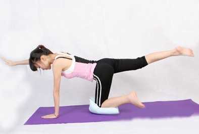 step2:身体向前弯曲,将折好的毛巾垫在膝盖下方,双臂伸直撑地,抬起臀部,头部放低,面部朝向地板,大腿绷直,臀部微微后靠,伸直背部。