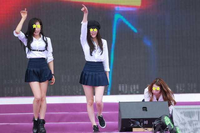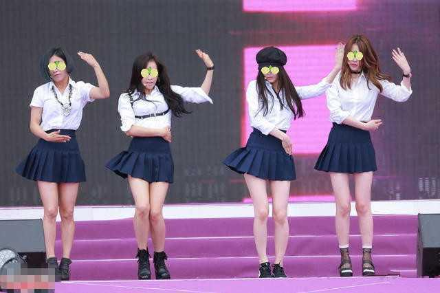 韩国人气女子组合f(x)以校服短裙打扮亮相,队长宋茜的束胸服饰十分养眼,性感舞步也露出打底裤,而成员雪莉则于跳舞时不慎滑倒,还走光露黑色胸围,引起现场一阵骚动。