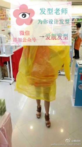 不过第二照片就好搞笑了,只见蔡依林在一个类似便利商店的地方,被一件好大件的轻便雨衣从头套到脚踝,被遮盖了漂亮的样子,十分狼狈又好笑。