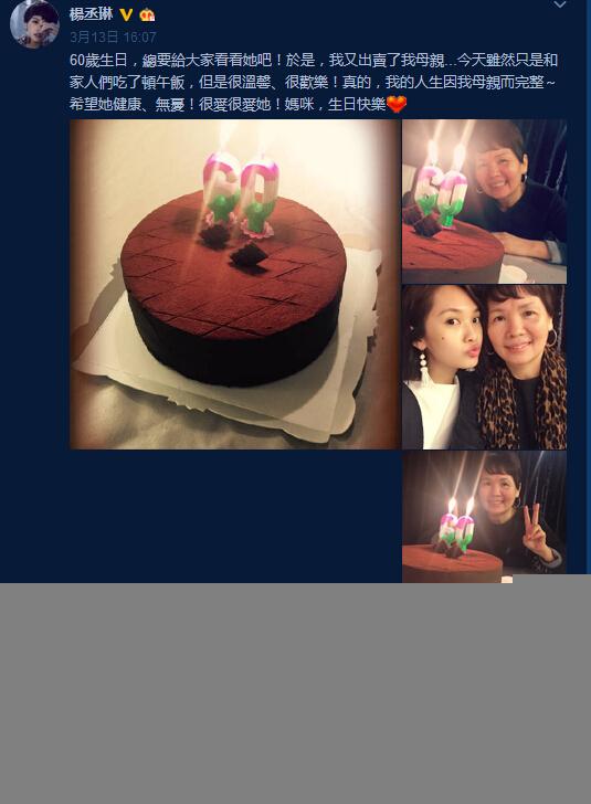 3月13日是杨丞琳妈妈的60岁生日,杨丞琳很贴心的为妈妈准备了黑森林蛋糕,从杨丞琳发出来的图片看,她的妈妈保养得很好,脸上完全看不出60岁的痕迹。