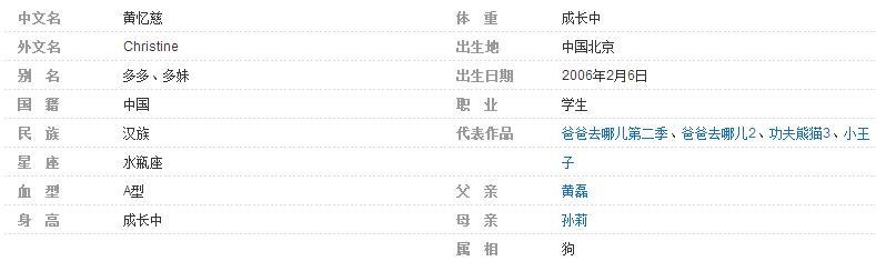 黄忆慈出生于2006年2月6日,目前就读于北京市私立汇佳学校,是一所融合国际先进文化和教育理念的学校,对入学生的英语水平要求很高,要通过考试,难怪多多英语那么好,每年学费为13万。